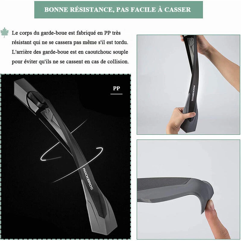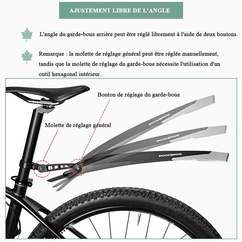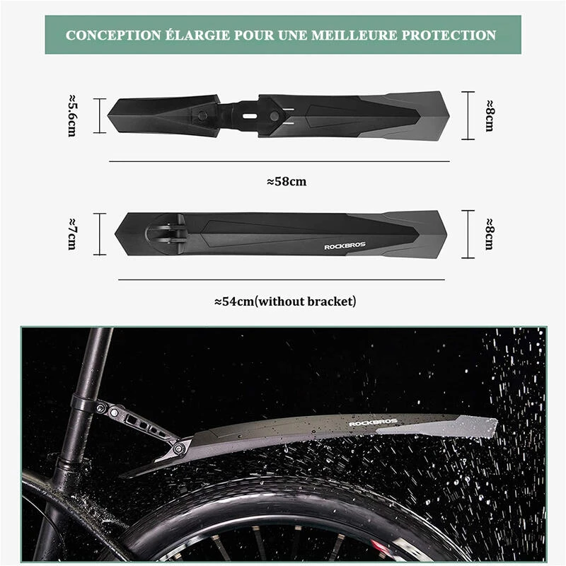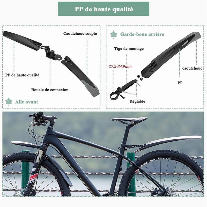 Angle Réglable; Les garde-boue sont en PP et en caoutchouc flexible; Les garde-boues conviennent aux VTT de 26 » et 27,5 ».