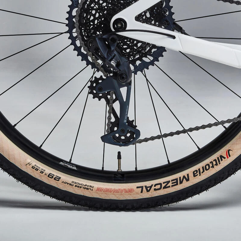 Poids sans pédales, avec chambres à air dans sa version de base (Groupe Sram GX Eagle mécanique et roues Mavic Crossmax Aluminium)