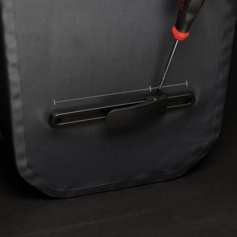 Le système de fixation bas réglable sur rail permet de bien fixer le bas de la sacoche à la jambe du porte bagages, améliorant ainsi la stabilité de l’ensemble en cas de secousses.